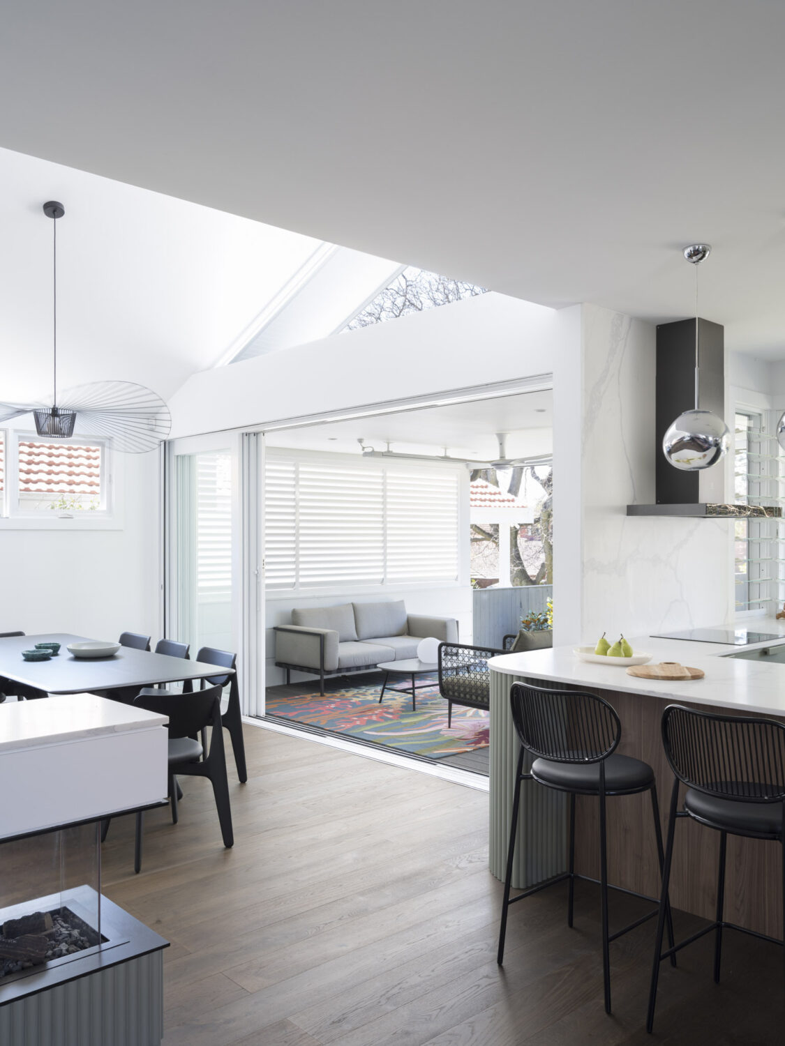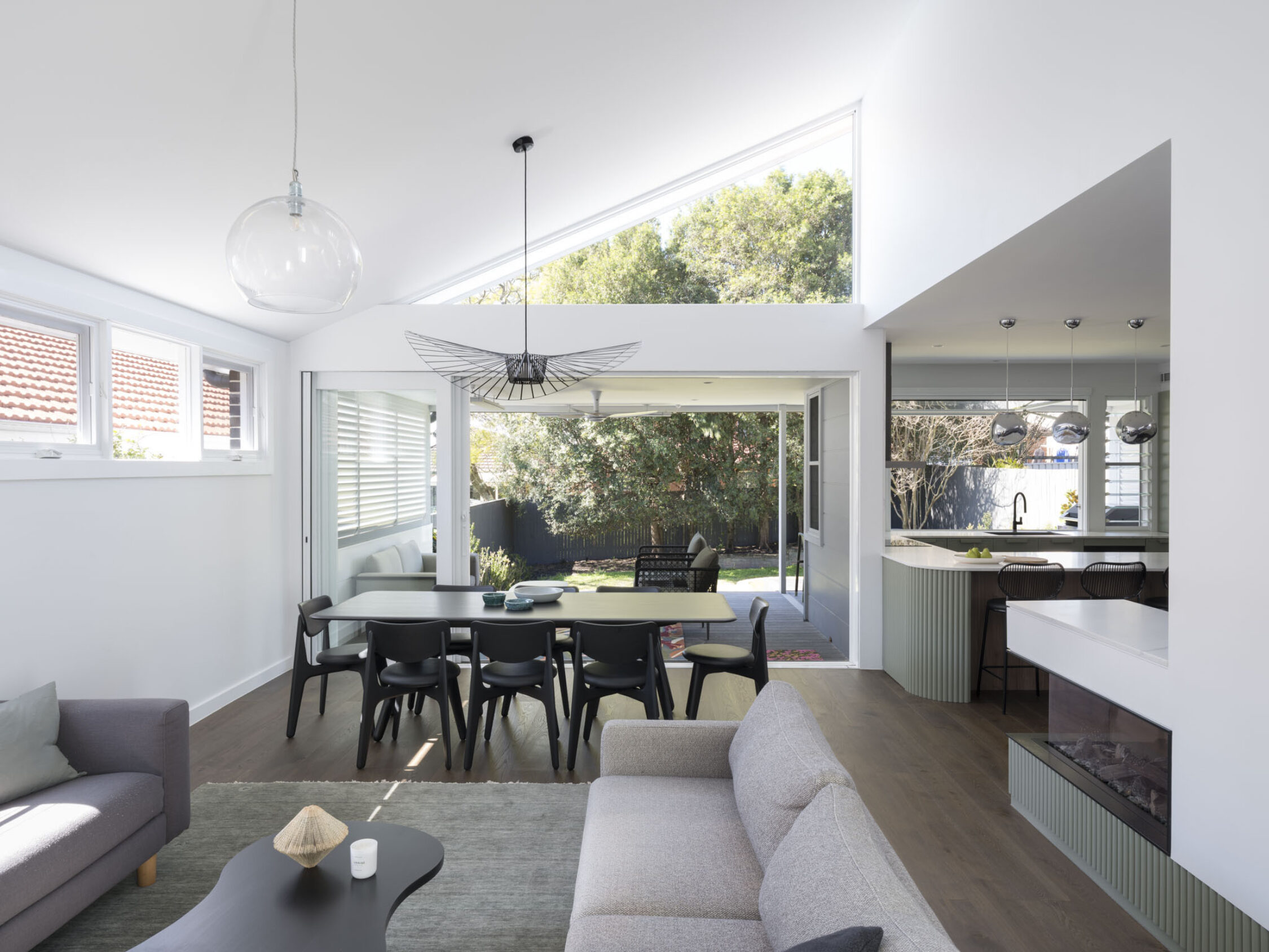 Various opportunities for spatial modulation throughout the new rear living spaces were explored, resulting in an opening up of the rear hipped roof and the lifting of the roofline. This simple but highly effective architectural move afforded the opportunity for a raking ceiling and stunning highlight windows, promoting internal height, natural light and foliage-filled views.