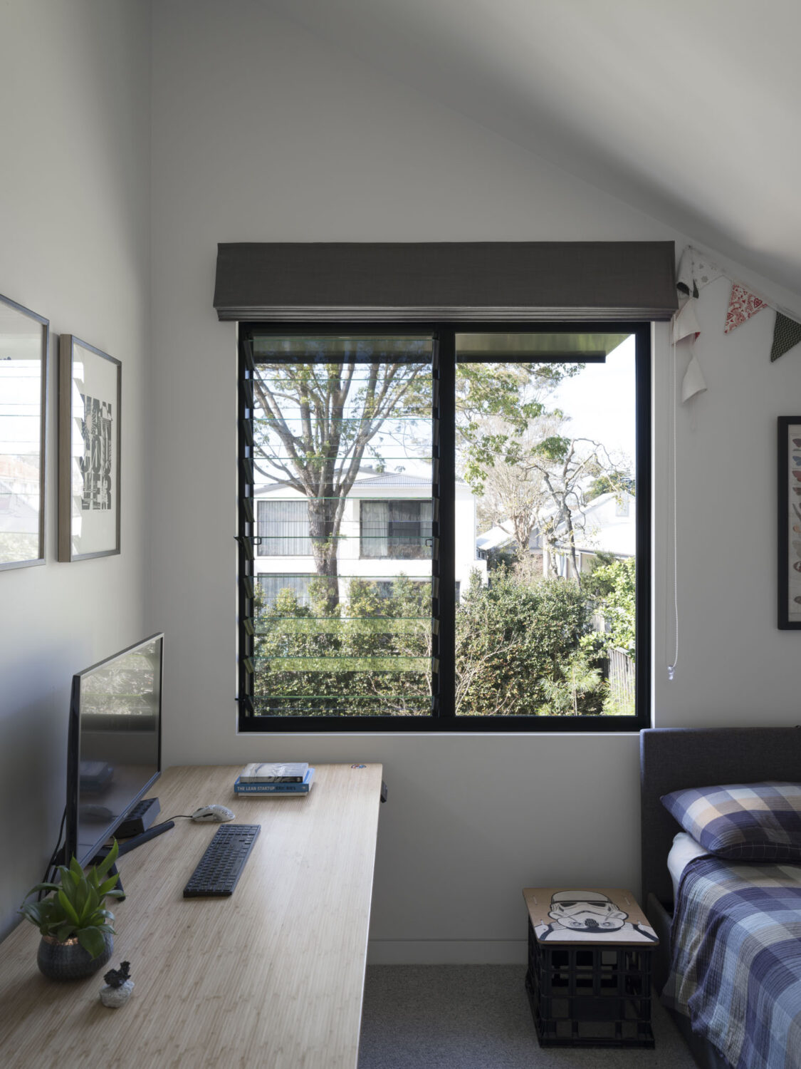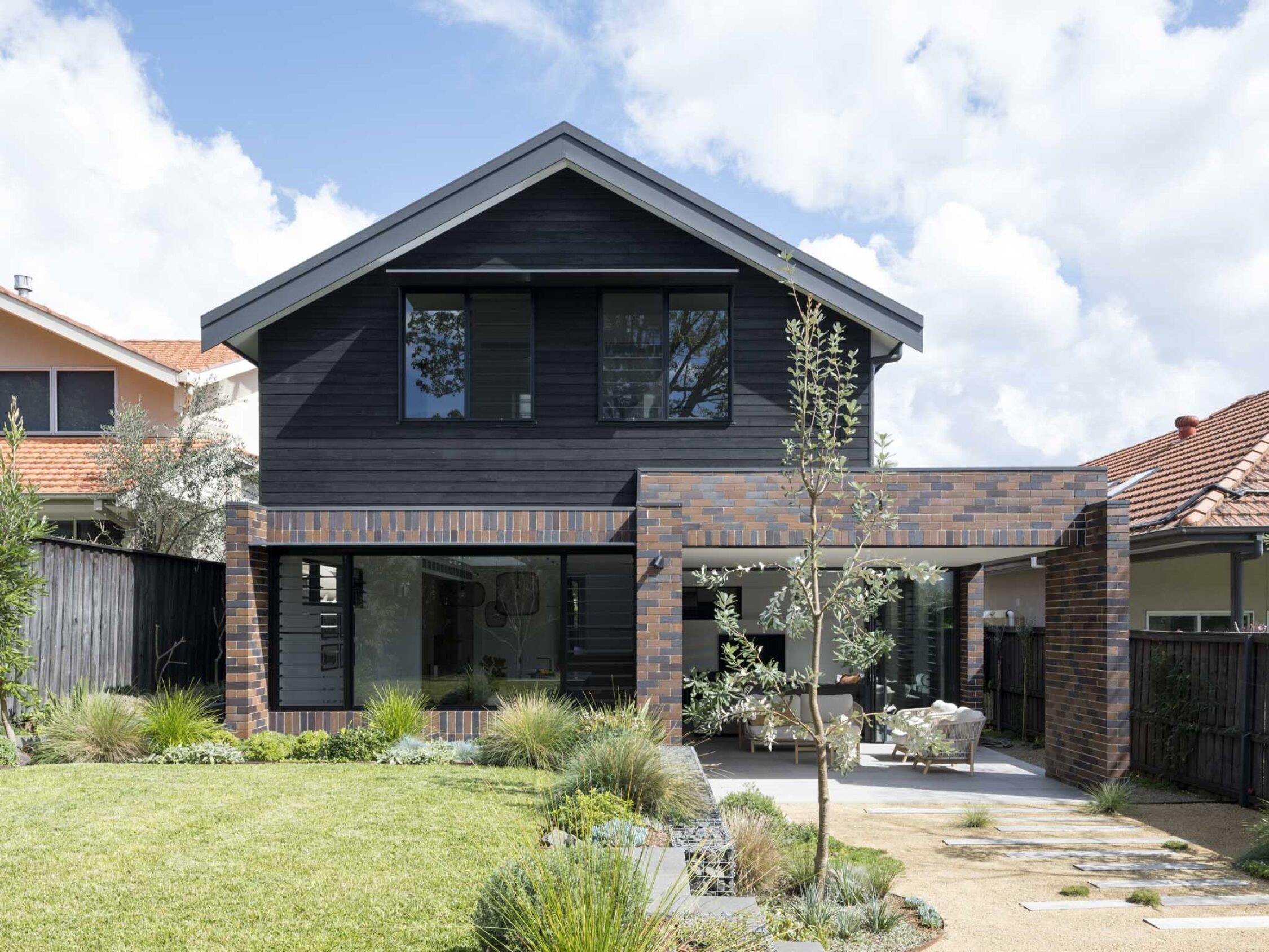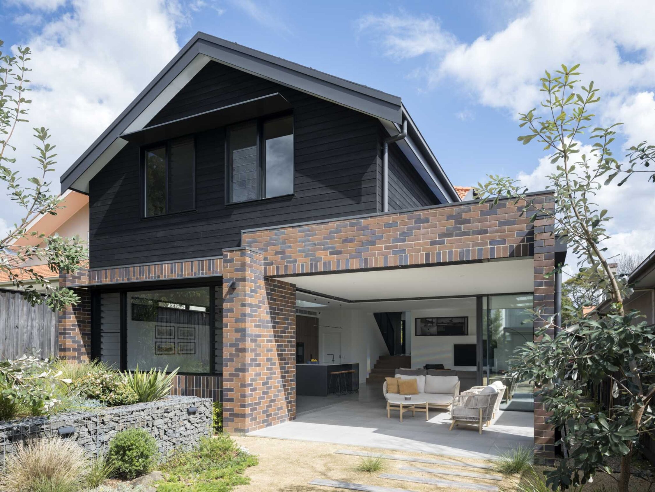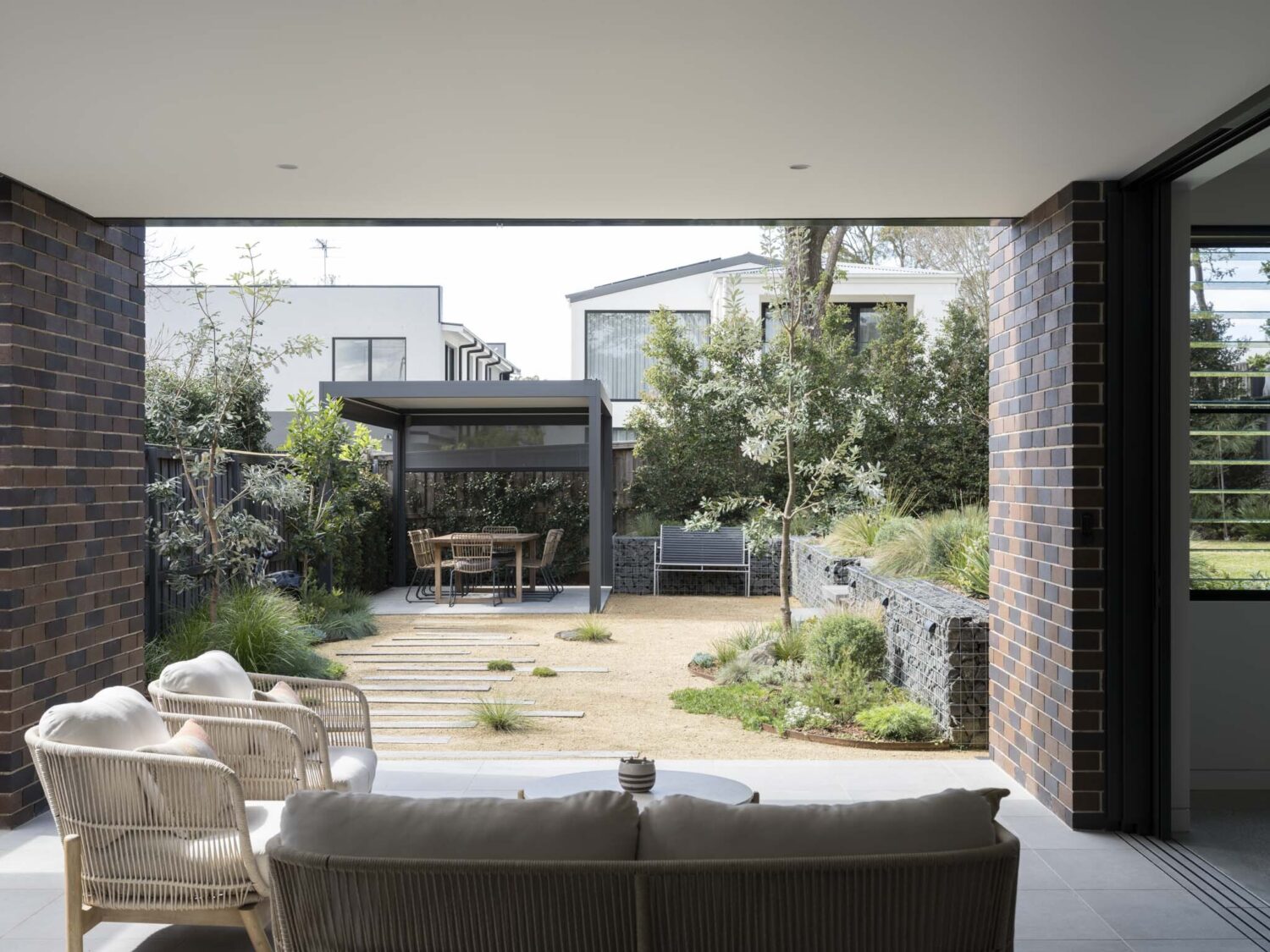 Pulling the whole site together is the comprehensive landscaping scheme, designed and built by our horticulturalist client. Native ground covers accompany the mature tree arcing over the front entry path, perfectly framing the new entry to the dwelling. At the rear, an L-shaped gabian wall retains and articulates the raised lawn, with grasses, shrubs and feature trees intermingling with informal ground treatments.