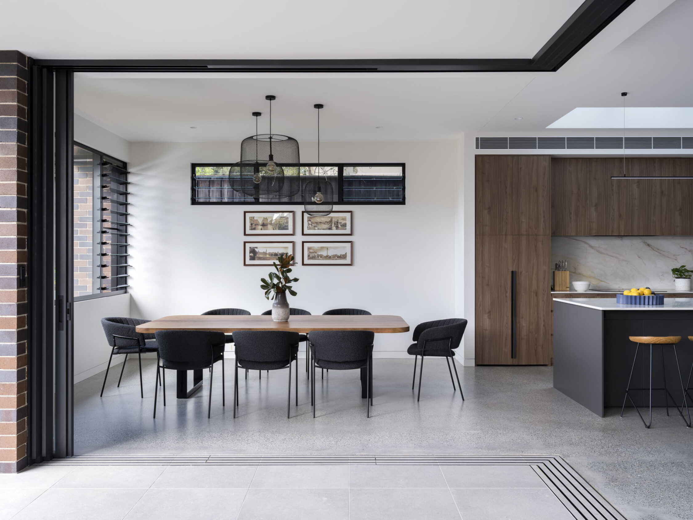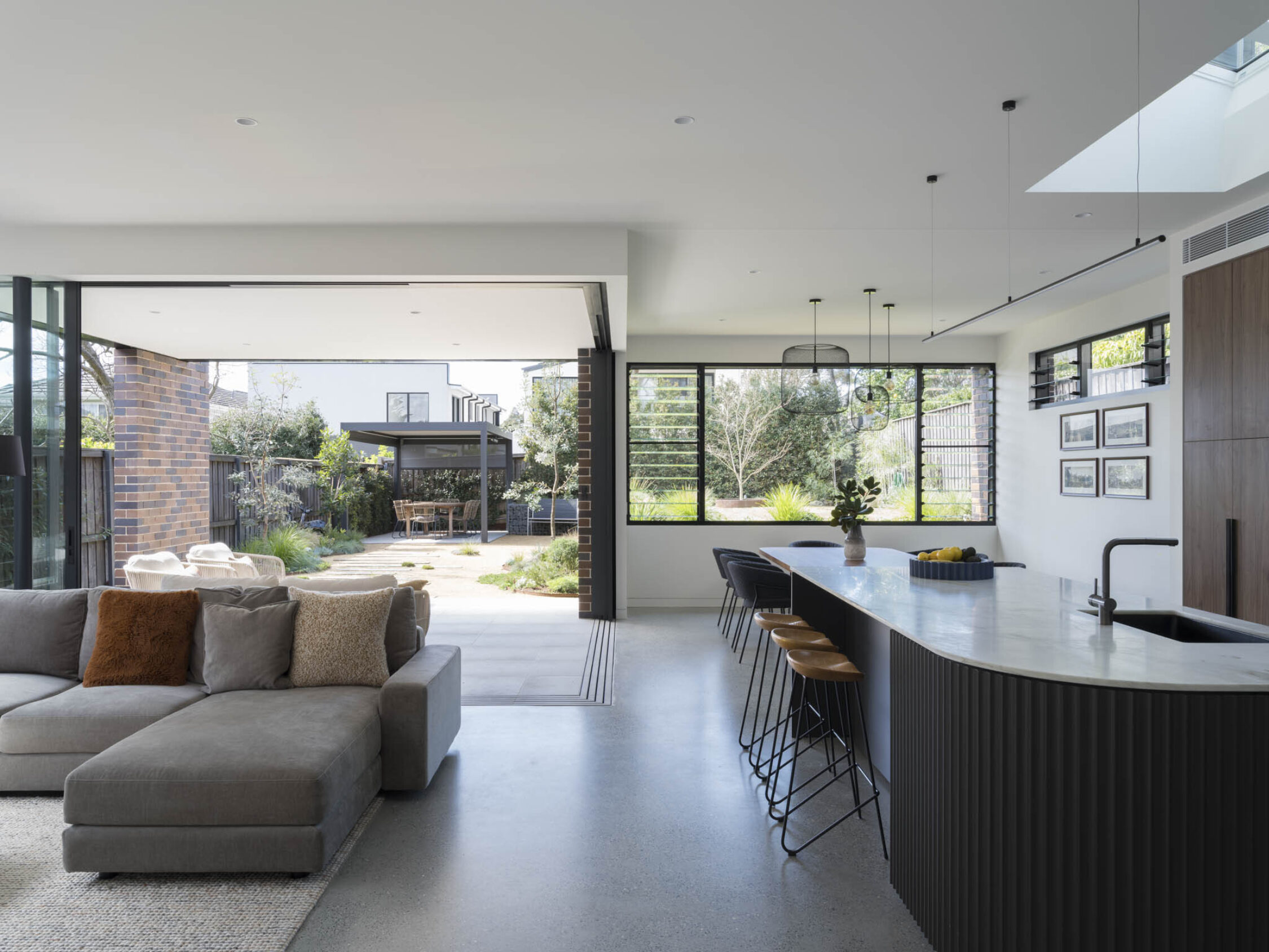 A generous open plan kitchen, dining and living room with stacking glazed doors completely opens the home to the new rear patio, blurring the lines between inside and out. The material expression – traditional bricks, polished concrete floor and the Shou Sugi-Ban timber – provides a warmth and strength to the renewed dwelling.