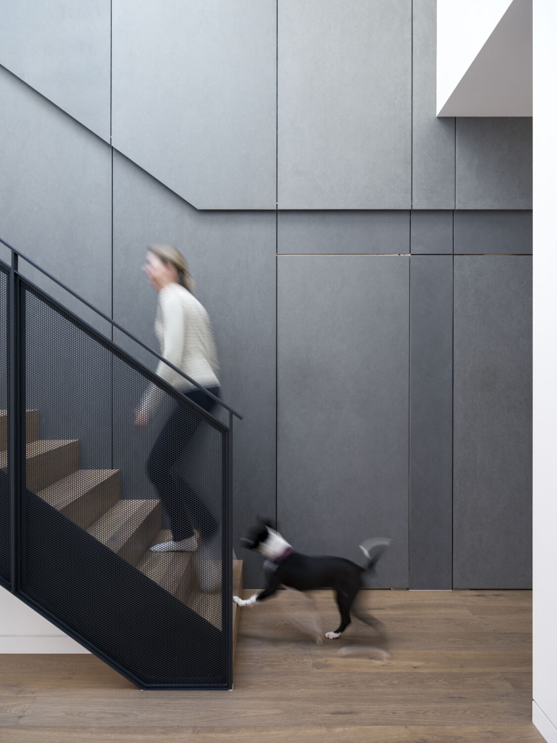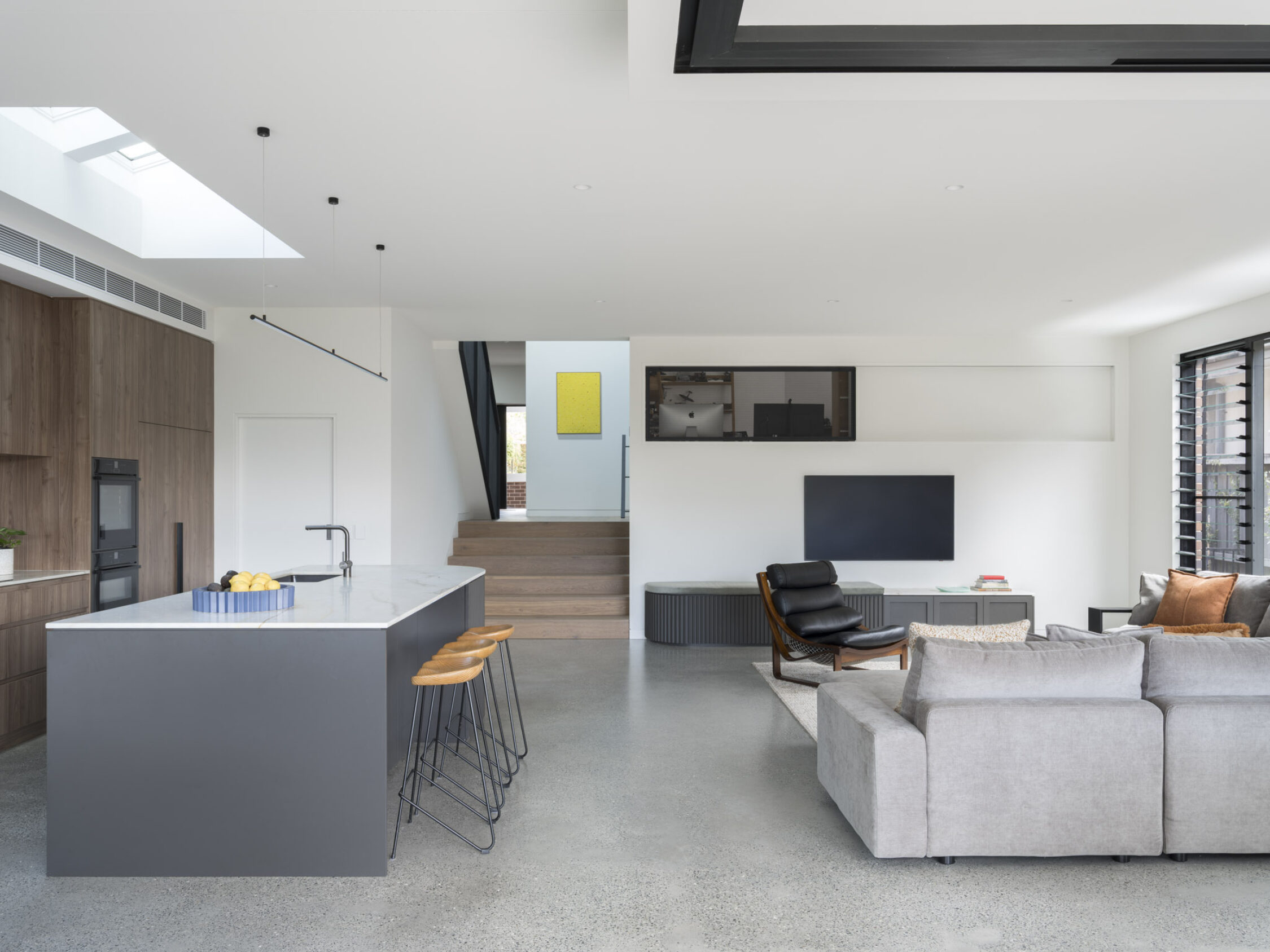 As the design developed, the feature wall clad in Barestone was integrated with the main circulation spine, wrapping from the entry foyer and leading you down the hallway while cleverly hiding utility spaces behind subtle pivot doors - including a striking powder room. Integrated LED lighting mediates the folded, overlapping spaces, leading the eye up and along the dramatic raking ceiling over the double height void.