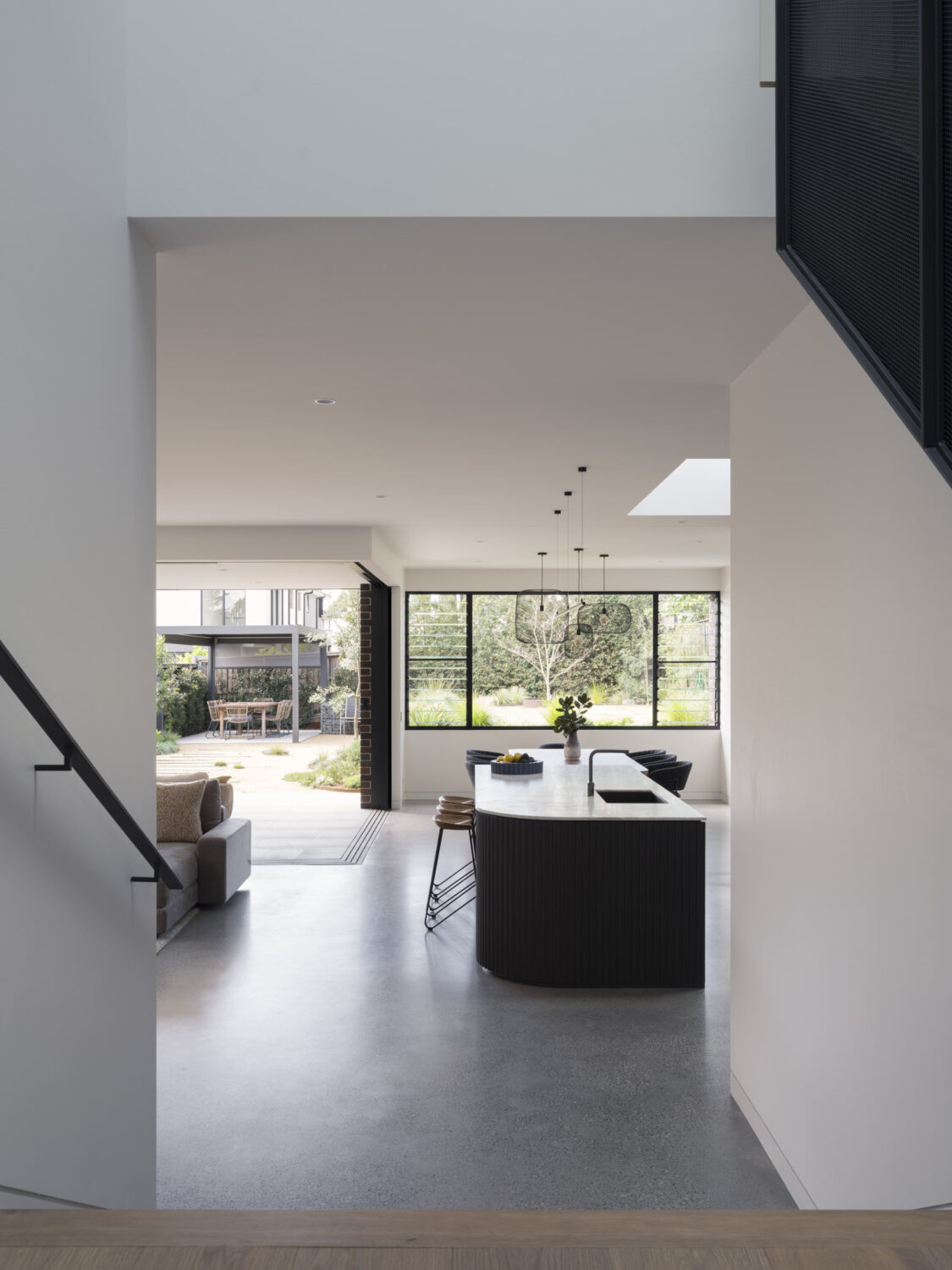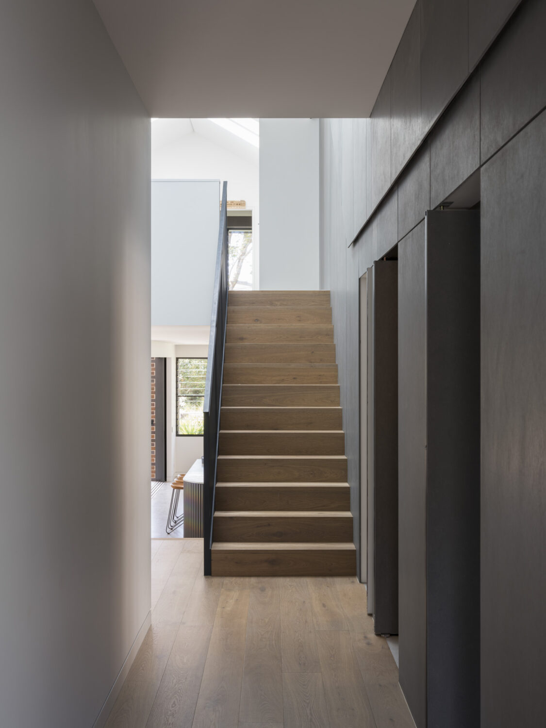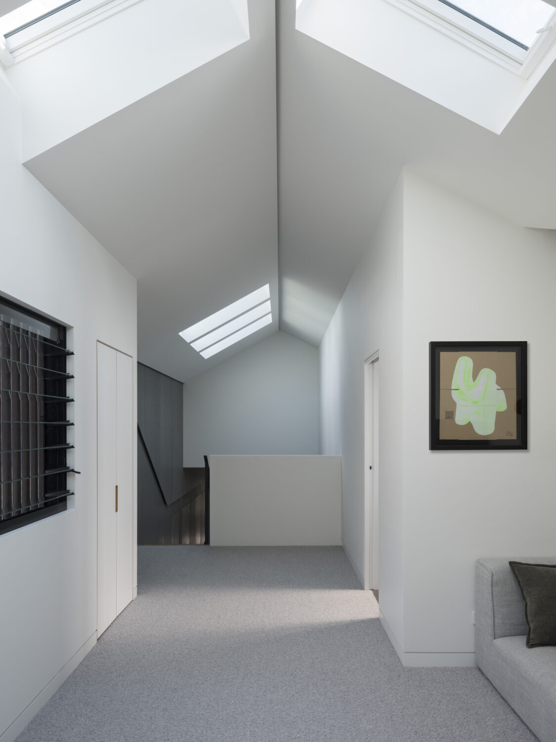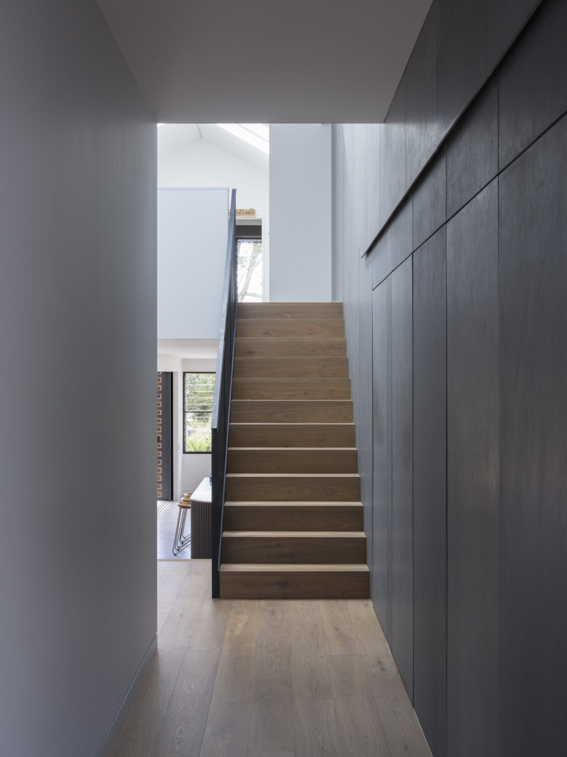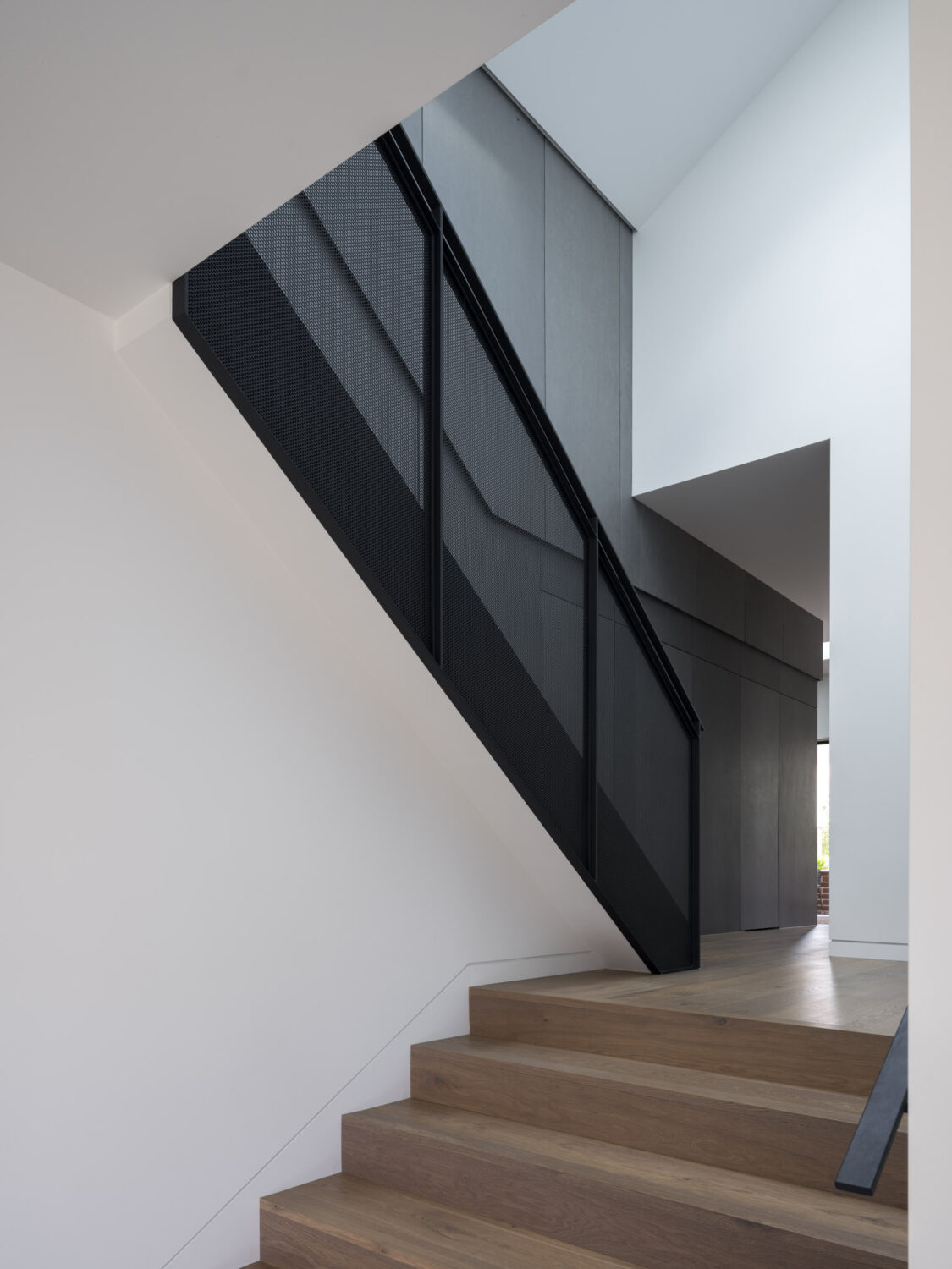 By shifting the front entry, we then completely reconsidered the orientation and purpose of the original rooms. This brought significant benefit to the spatial character of the expanded home, facilitating the interlocking of old and new spaces to form the split level rear addition, and enabling a new roof form with skylights streaming light into the previously dark spaces. A custom perforated metal balustrade slinks up the stairs, both screening and elevating the space.