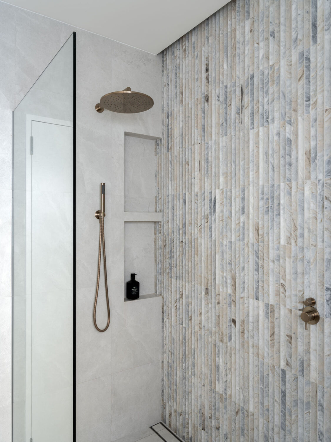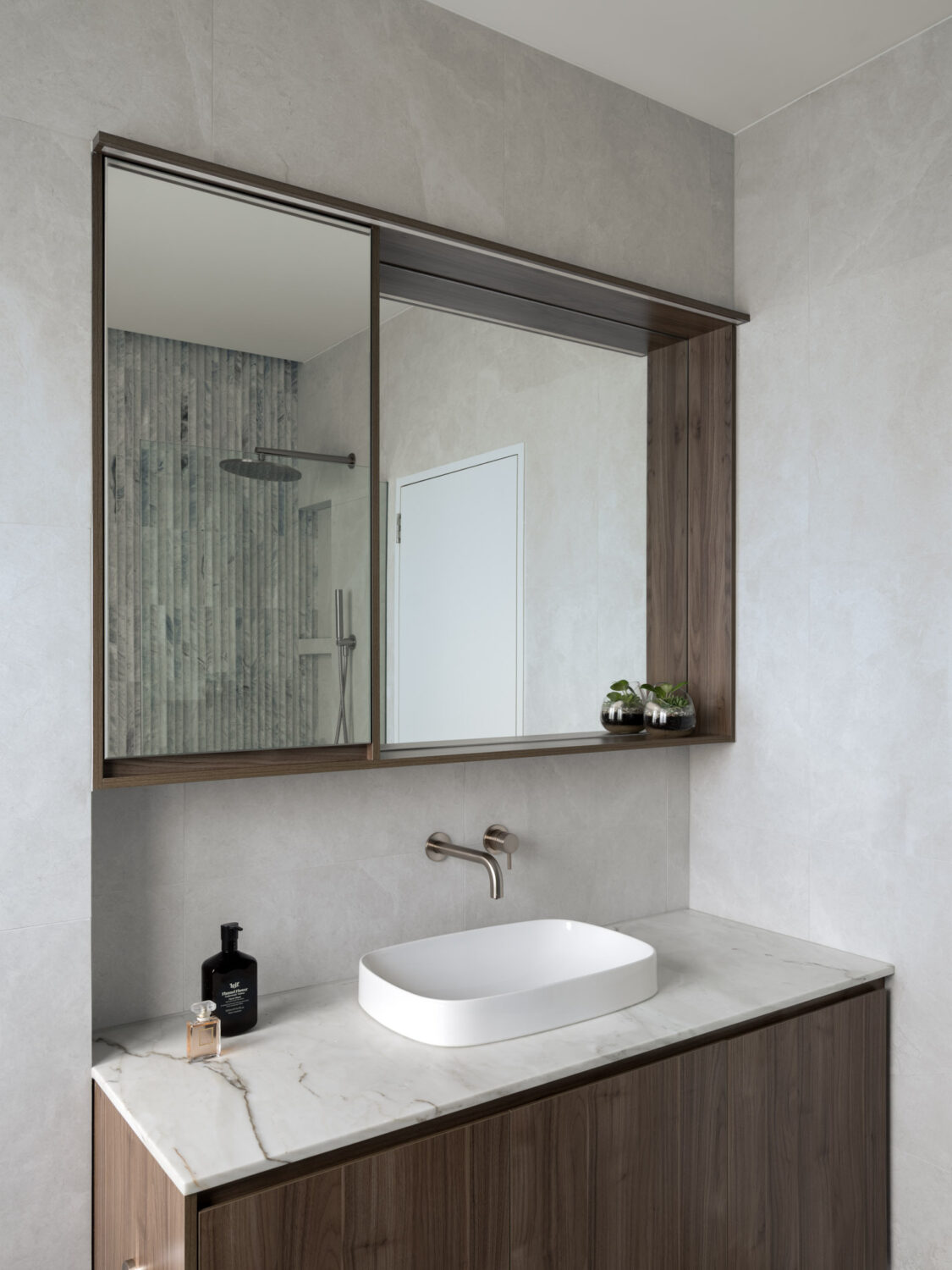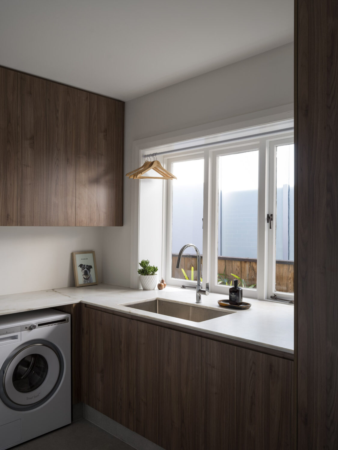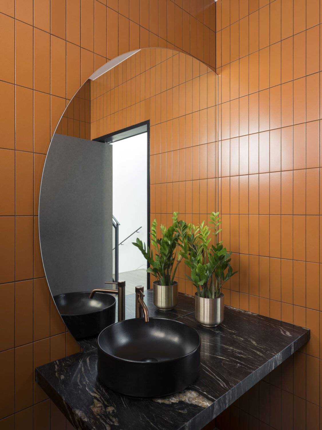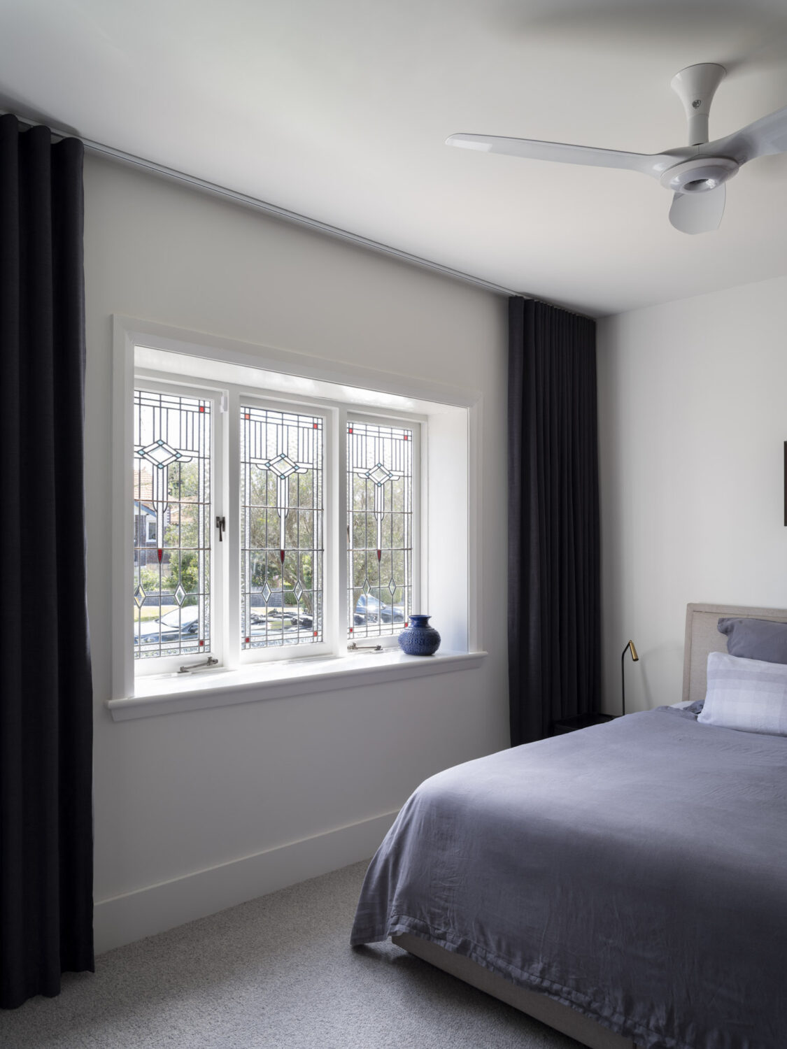 Where possible, period details in the original portion of the dwelling were retained, with new interior elements designed to compliment their colour, scale and patina. Soft-toned fluted stone, burnished metal finishes, deep hues and warm timbers compliment the deep reveals, refurbished timber framed windows, filigree stained glass and high skirtings.